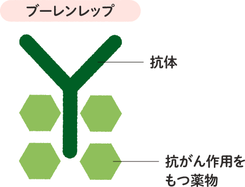 ブーレンレップは、抗体に抗がん作用をもつ薬物をつなげた「抗体薬物複合体(こうたいやくぶつふくごうたい)(ADC:エーディーシー)」と呼ばれるタイプのお薬です。