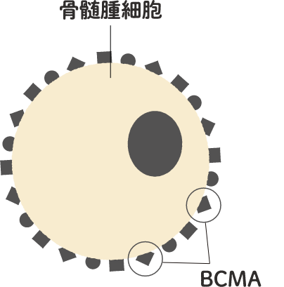 BCMAは、骨髄腫細胞の表面にあるタンパク質のことです。骨髄腫細胞の増殖や生存にかかわっており、多発性骨髄腫の患者さんの骨髄腫細胞の表面には、BCMAがたくさんあります。